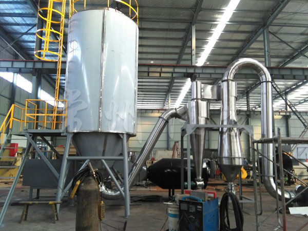本機(jī)是將料液壓入壓力噴嘴霧化成微小霧滴,在塔內(nèi)與熱風(fēng)以對流的方式完成干燥,獲得顆粒產(chǎn)品。
