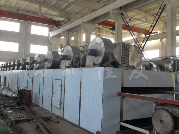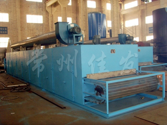 物料由加料器均勻地鋪在網(wǎng)帶上,網(wǎng)帶一般采用12-60目不銹鋼絲網(wǎng),由傳動(dòng)裝置拖動(dòng)在干燥機(jī)內(nèi)移動(dòng)。干燥機(jī)由若干單元組成,每一單元熱風(fēng)獨(dú)立循環(huán),部分尾氣由專門濕風(fēng)機(jī)排出,廢氣由調(diào)節(jié)閥控制,熱氣由下往上或由上往下穿過(guò)鋪滿物料的網(wǎng)帶完成熱量與質(zhì)量傳遞的進(jìn)程,帶走物料的水份。網(wǎng)帶緩慢移動(dòng),運(yùn)行速度可根據(jù)物料溫度自動(dòng)調(diào)節(jié),干燥后的成品連續(xù)落入收料器中。上下循環(huán)單元根據(jù)用戶需要可靈活配備,單元數(shù)量亦可根據(jù)需要選取。