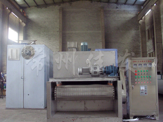 The material is evenly laid on the mesh belt by the feeder, and the mesh belt is generally made of 12-60 mesh stainless steel wire mesh, which is dragged by the transmission device and moved inside the dryer. The dryer is composed of several units, each with independent circulation of hot air. Part of the exhaust gas is discharged by a dedicated wet fan, and the exhaust gas is controlled by a regulating valve. The hot air passes through the mesh belt covered with materials from bottom to top or from top to bottom to complete the process of heat and mass transfer, taking away the moisture of the materials. The mesh belt moves slowly, and the running speed can be automatically adjusted according to the material temperature. The dried finished product continuously falls into the feeder. The upper and lower circulation units can be flexibly equipped according to user needs, and the number of units can also be selected according to needs.